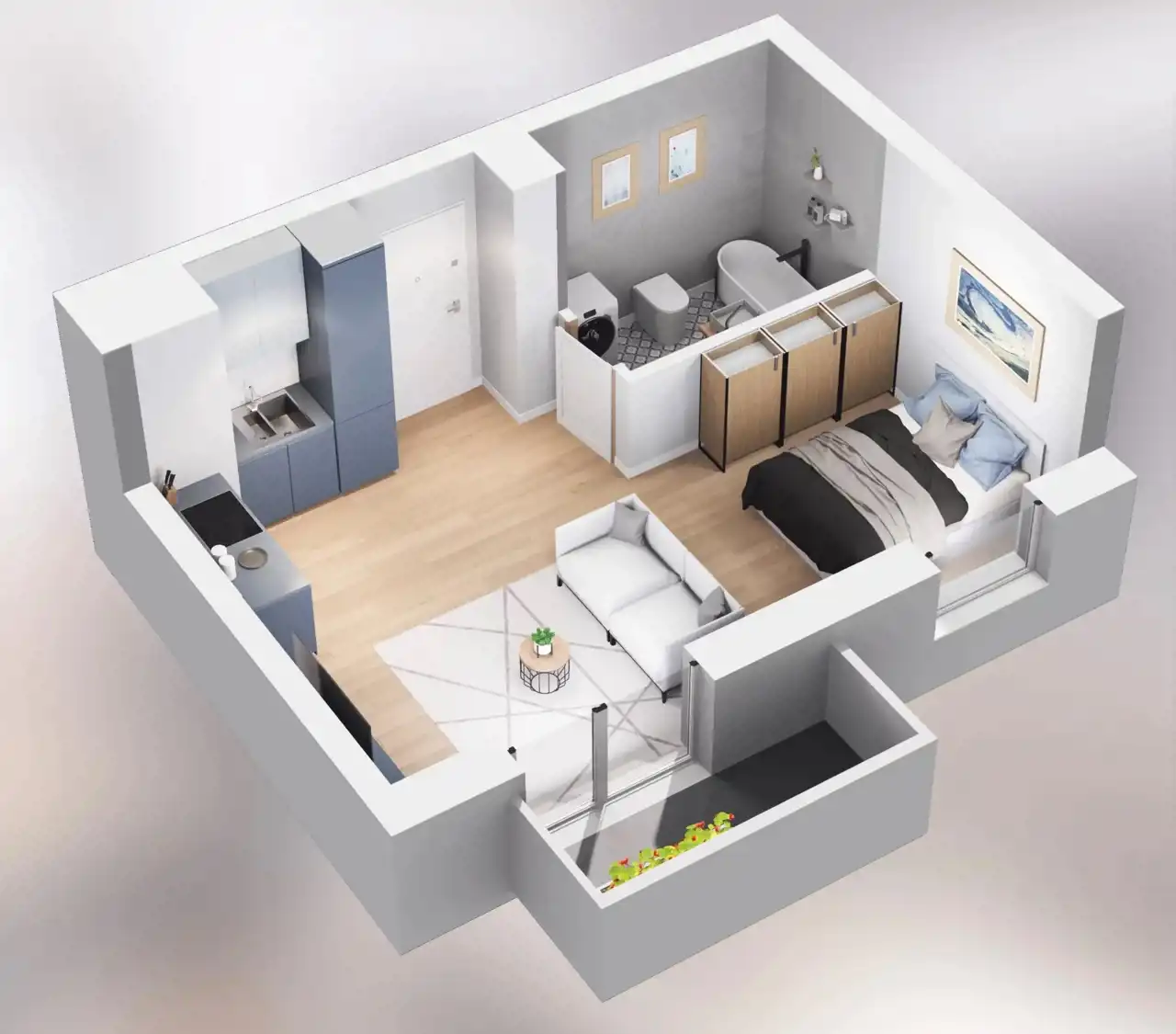 - salon z aneksem kuchennym (mozliwość wydzielenia sypialni)