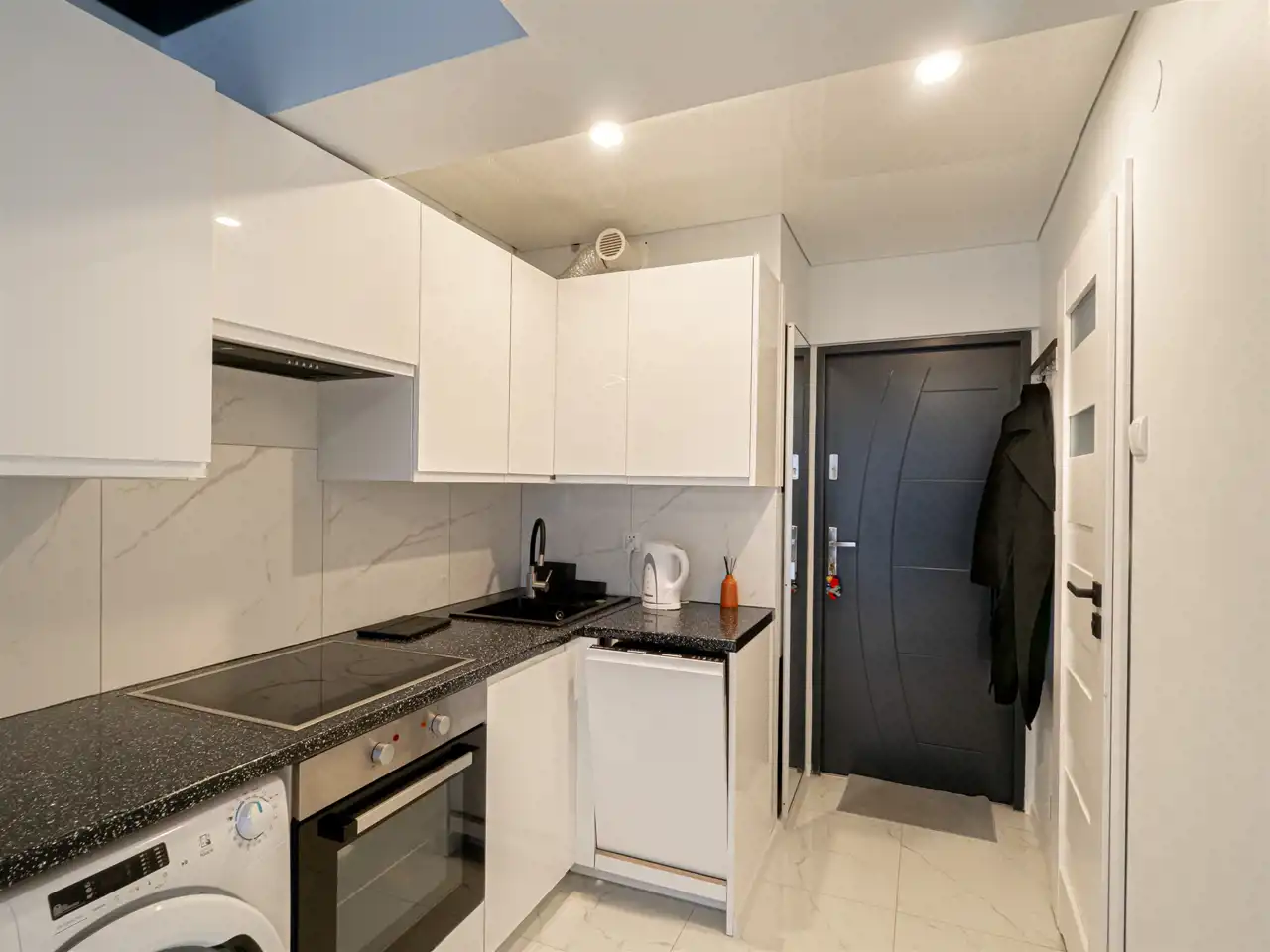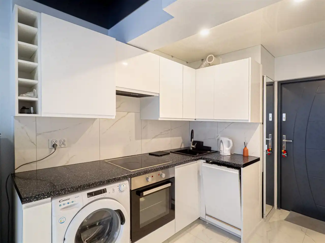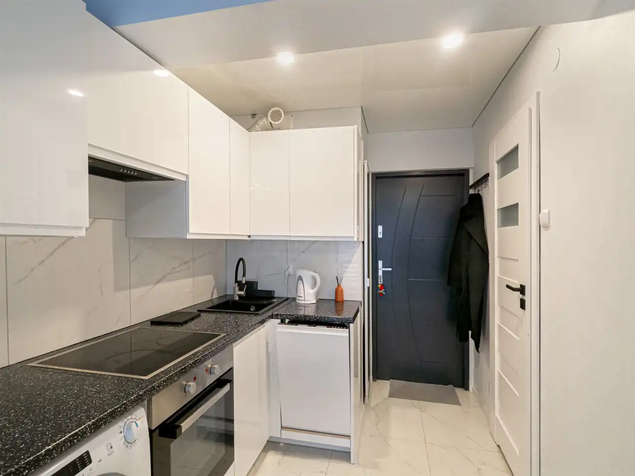 Mieszkanie o powierzchni 27 m2, składa się z salonu z rozkładaną sofą, aneksu kuchennego, przedpokoju, łazienki z prysznicem i WC. W minionym roku przeprowadzony został w nim remont generalny, uwzględniający m.in. wymianę instalacji elektrycznej i wod-kan. Na ścianach położone są gładzie, pytki na podłodze, zamontowano podwieszany sufit. Mieszkanie sprzedawane jest z całym wyposażeniem i meblami.