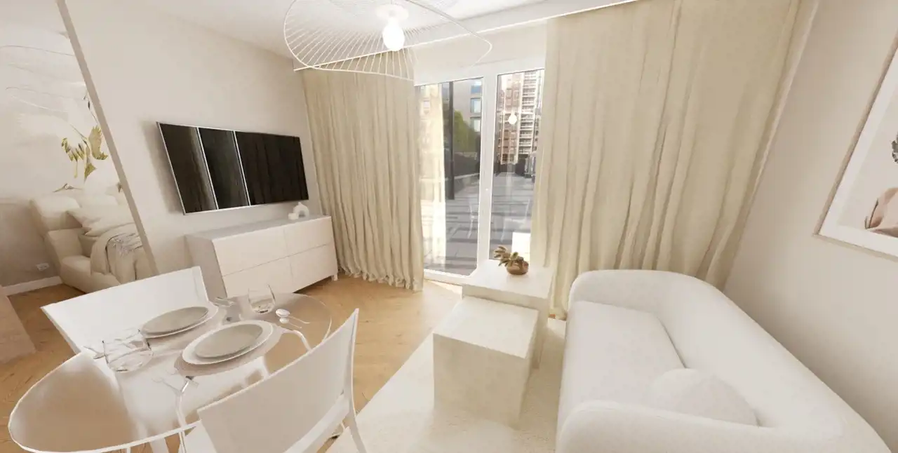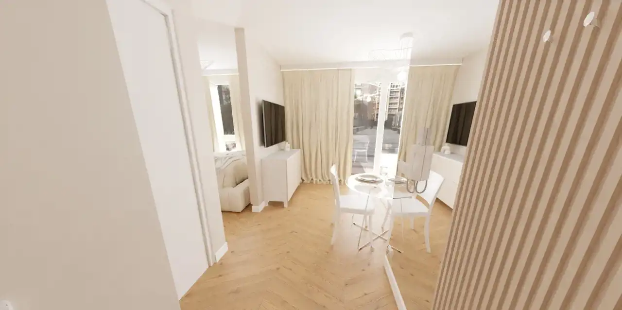 Kawalerka (o powierzchni około 28,50mkw) z możliwością wydzielenia oddzielnej sypialni, usytuowana na pierwszym piętrze nowego budynku z 2024 roku będącego cześcią osiedla Lokum Porto.