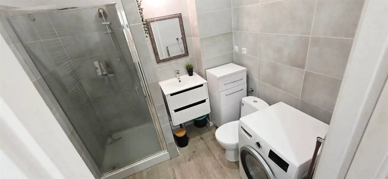 W łazience kafle, prysznic, umywalka, pralka i wc.