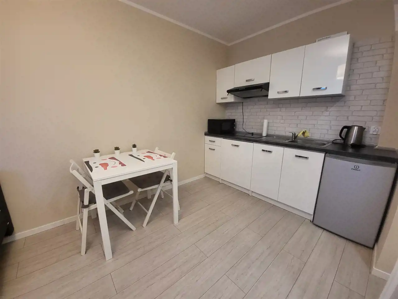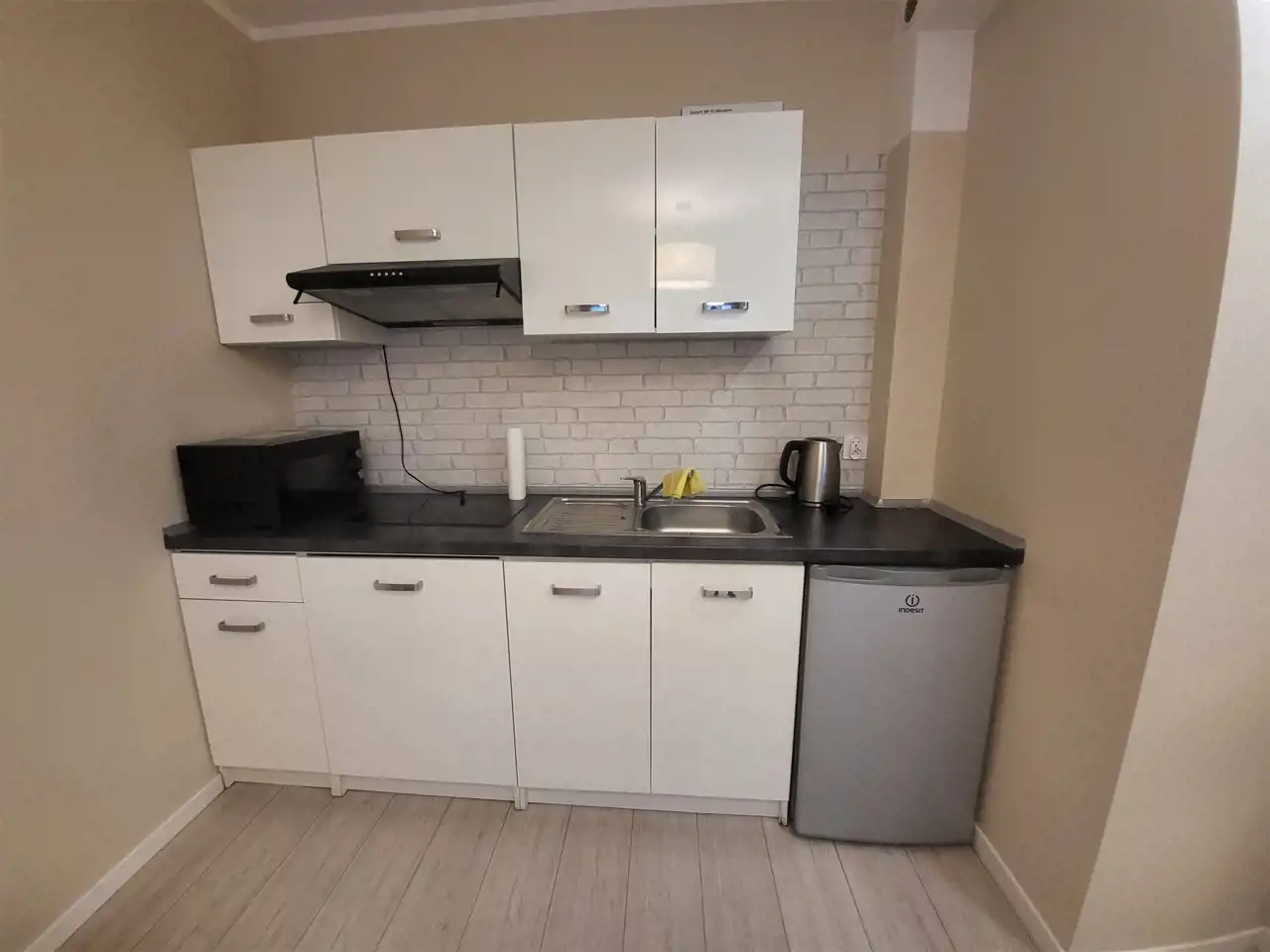 Aneks kuchenny z mebelkami kuchennymi i z potrzebnym sprzętem AGD.