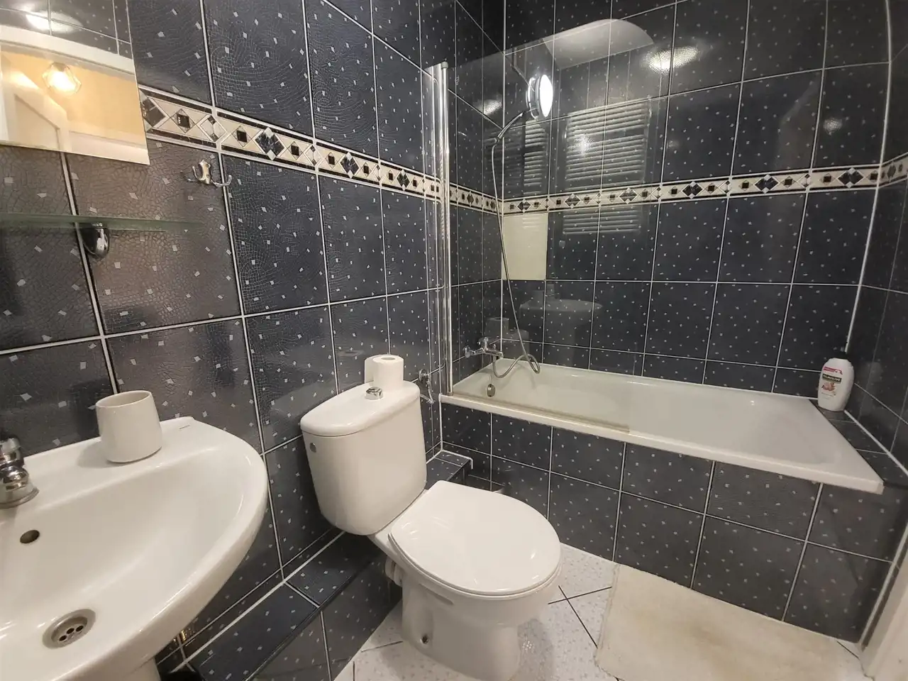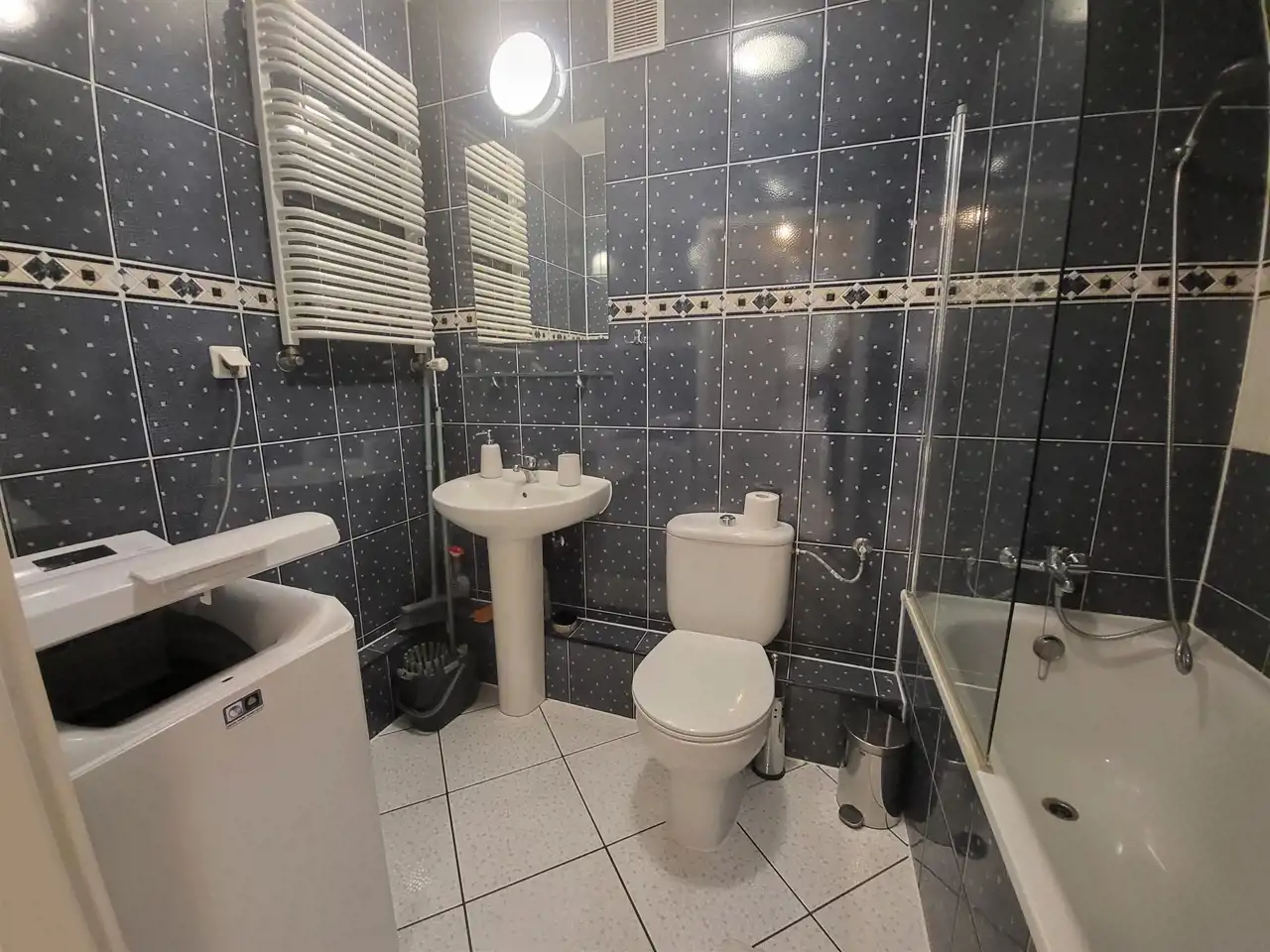 Łazienka razem z wc z wanną z parawanem z możliwością brania prysznica.