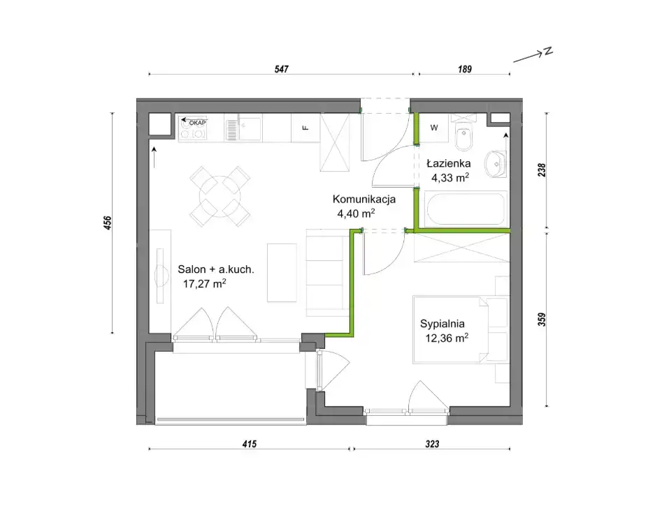 - Charakterystyka mieszkania 38.36 m2, 2 pokoje