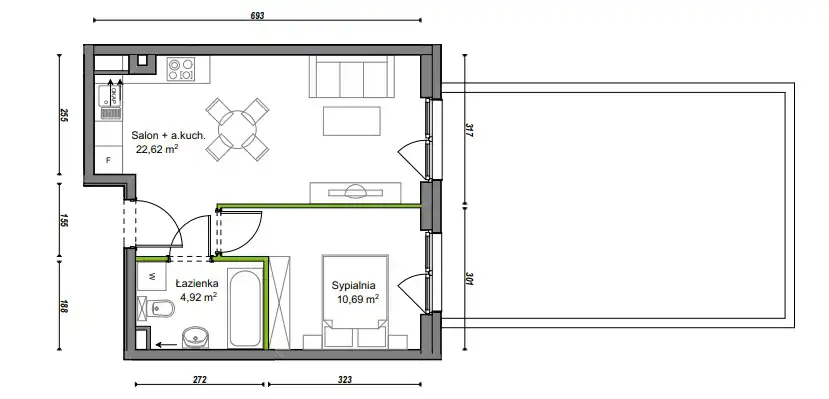 - Pokoju dziennego z aneksem kuchennym - około 22,62 m2