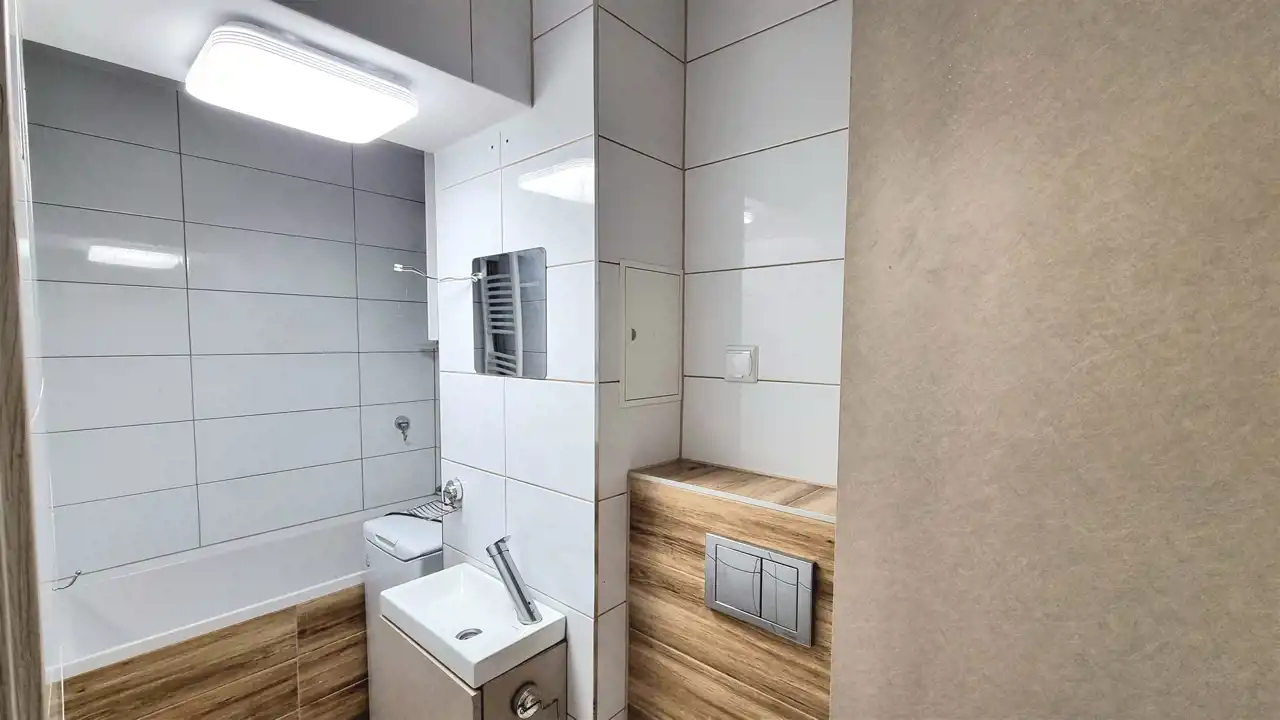- Łazienka z WC 4,5m2 – wanna, piec dwufunkcyjny, pralka.