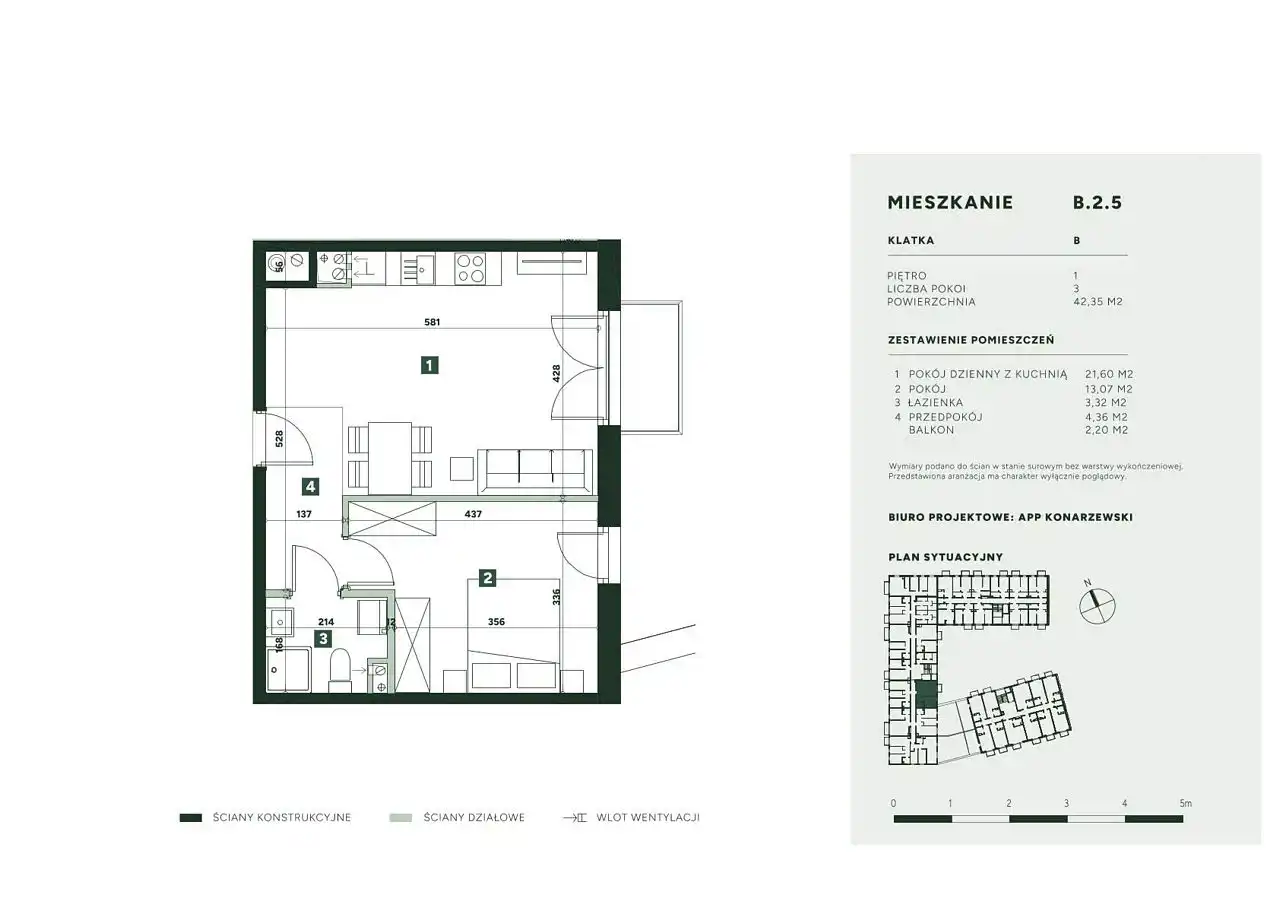- Charakterystyka mieszkania 42.35 m2, 2 pokoje