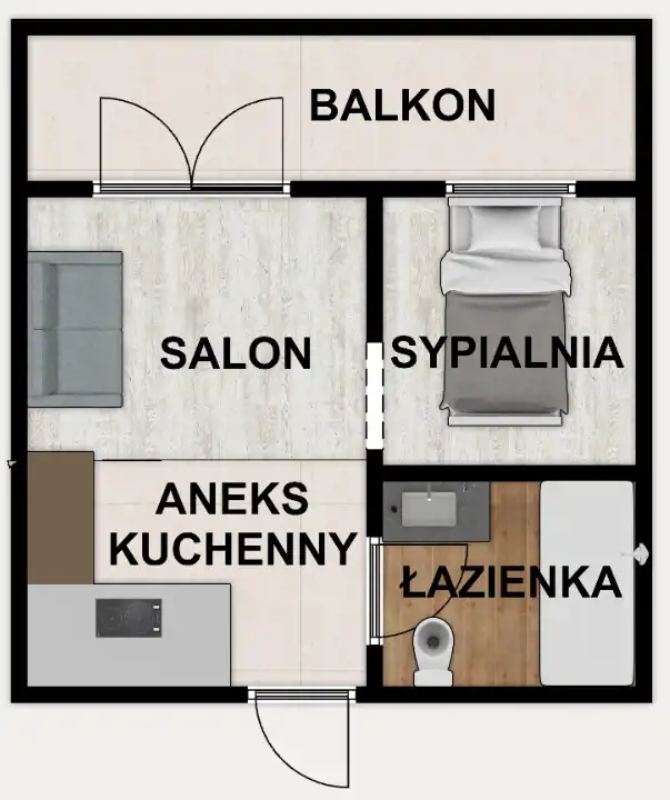 - salonu z aneksem kuchennym,
