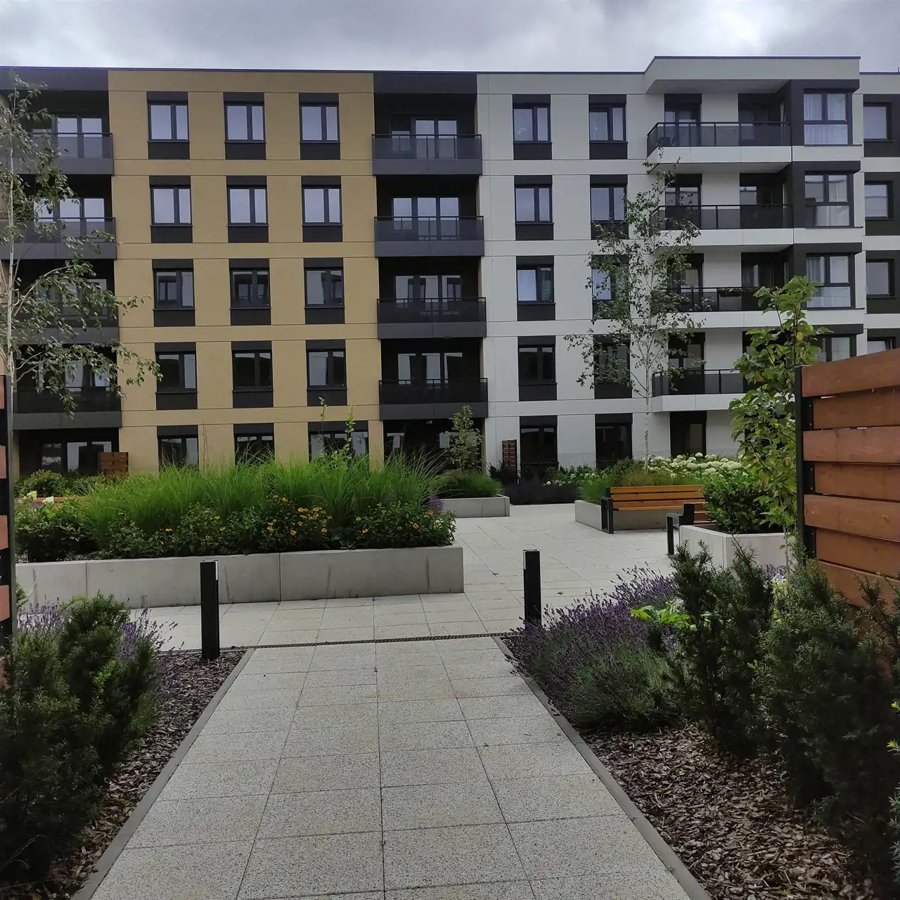 Osiedle dobrze zaprojektowane, między budynkami są zagospodarowane patia obficie udekorowane licznymi zielonymi, kwitnącymi krzewami.