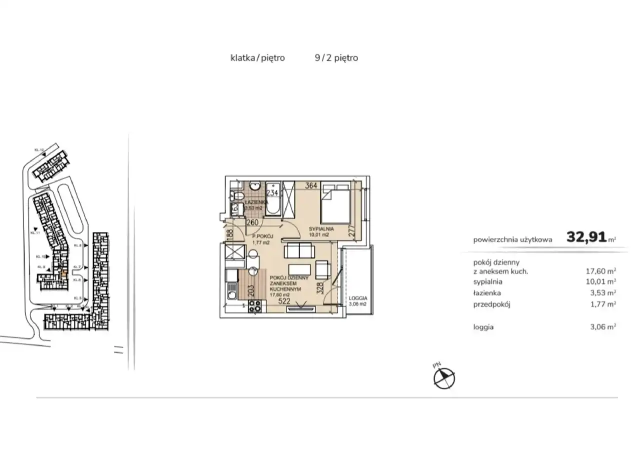 Funkcjonalny układ mieszkania – 33,1 m² + loggia 3,06 m²