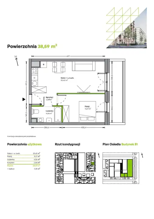 - Charakterystyka mieszkania 38.59 m2, 2 pokoje