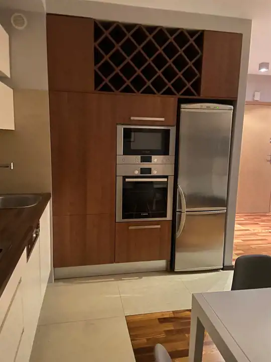 Kuchnia jest wyposażona w sprzęt AGD - piekarnik, płyta gazowa, mikrofalówka i zmywarka firmy Bosch - w zabudowie meblowej. Lodówka Amica wolnostojąca. Sprzęt pozostaje w mieszkaniu.