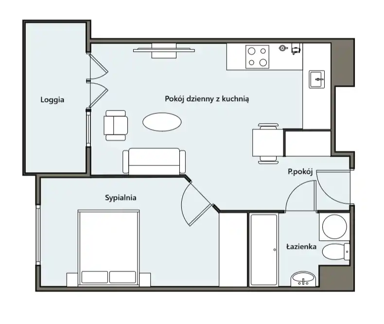 - pokój dzienny z aneksem kuchennym i wyjściem na loggie