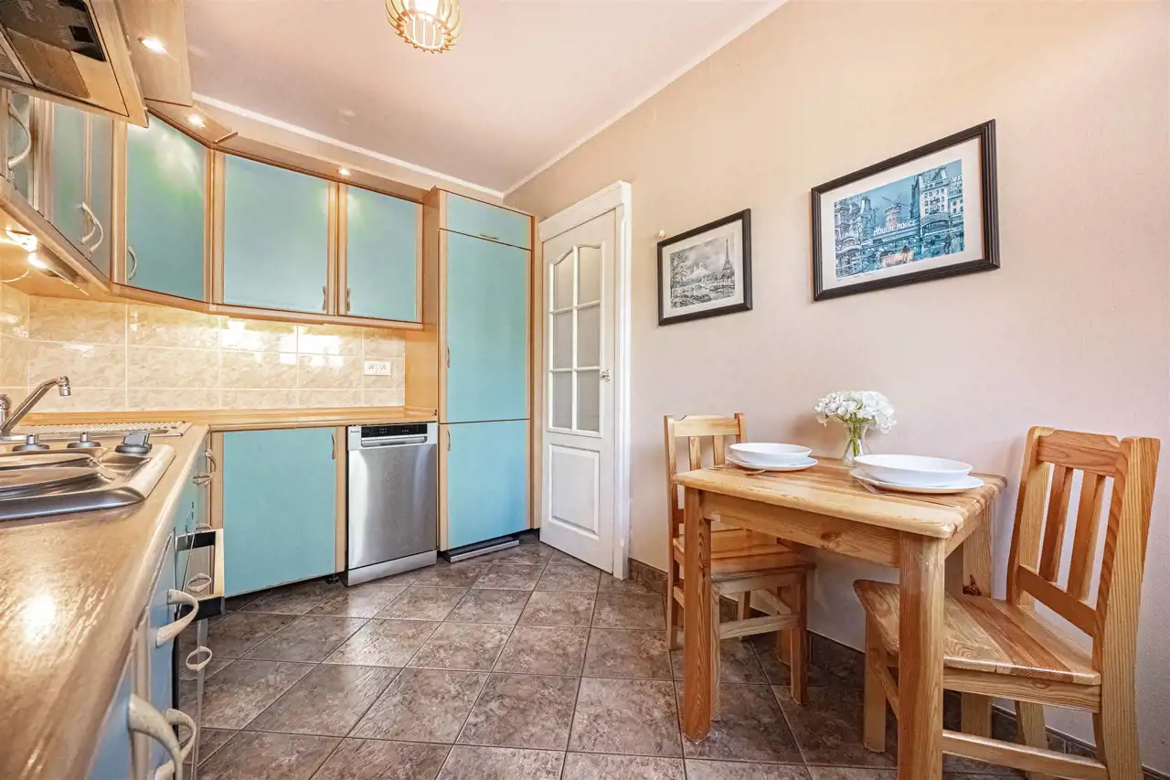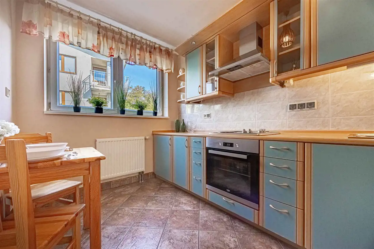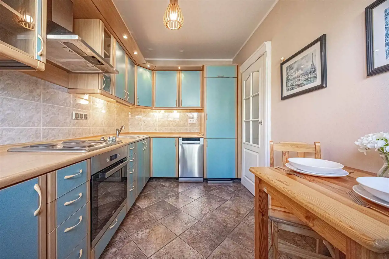 Kuchnia jest wyposażona w AGD: lodówka z zamrażarką, kuchenka elektryczna z piekarnikiem, nowa zmywarka oraz meble kuchenne.