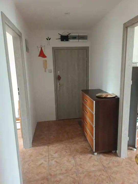 Okna PCV, w oknach rolety wewnętrzne, na podłogach gres, w łazience glazura, na ścianach gładzie.