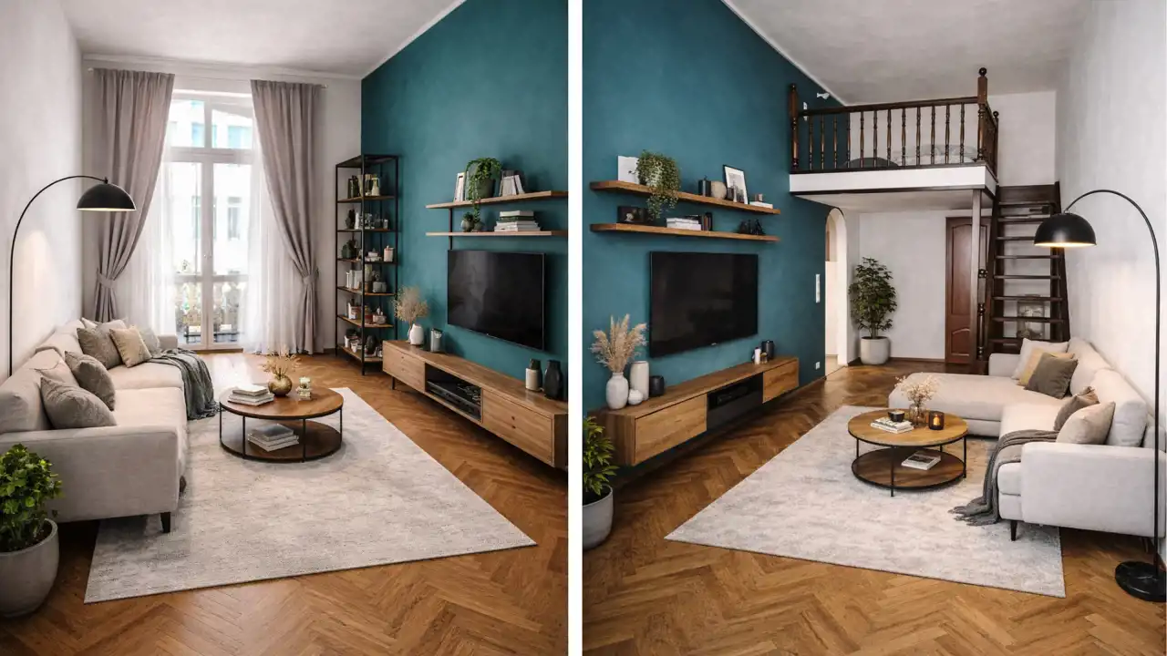 przestronny salon z wyjściem na balkon oraz drewnianą antresolą pełniącą rolę sypialni,