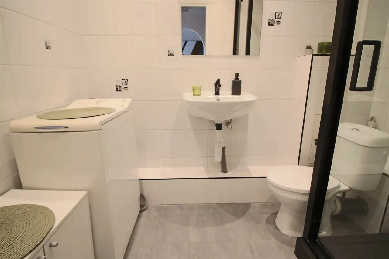 łazienka z kabiną prysznicową i miejscem na pralkę.