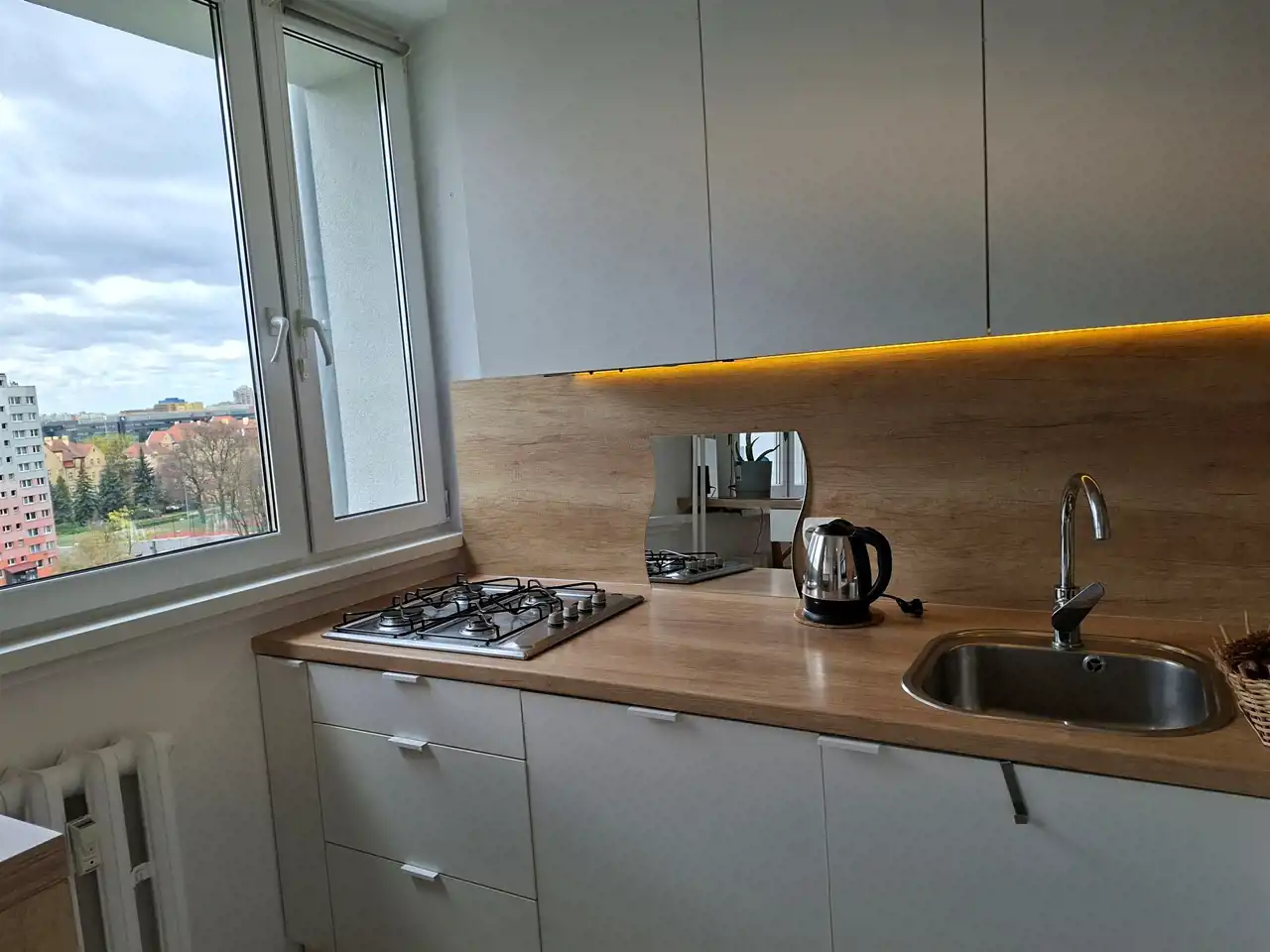 Nowe okna PCV, na podłogach panele lub płytki. Mieszkanie bardzo ciepłe i dobrze doświetlone – okna od strony południowej , zagospodarowanej działki z dojrzałą już roślinnością. Wszystko w mieszkaniu pozostaje.