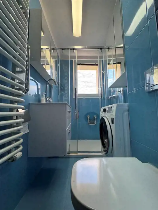 - Łazienka po remoncie z kabiną prysznicową i pralką