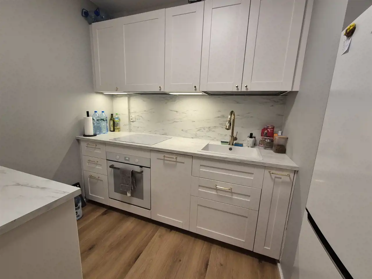 Aneks kuchenny z meblami w zabudowie wyposażony w sprzęt AGD.
