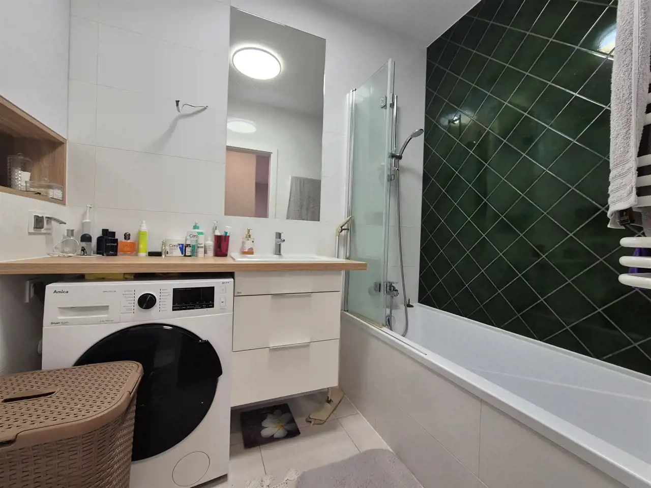 Łazienka razem z wc z wanną z możliwością prysznica, zabudowa ścienna.