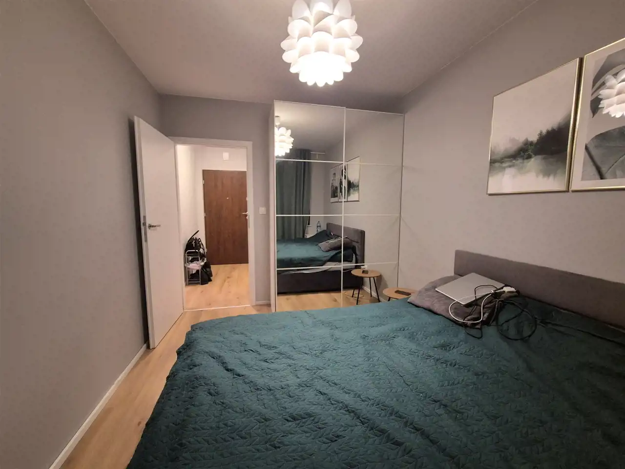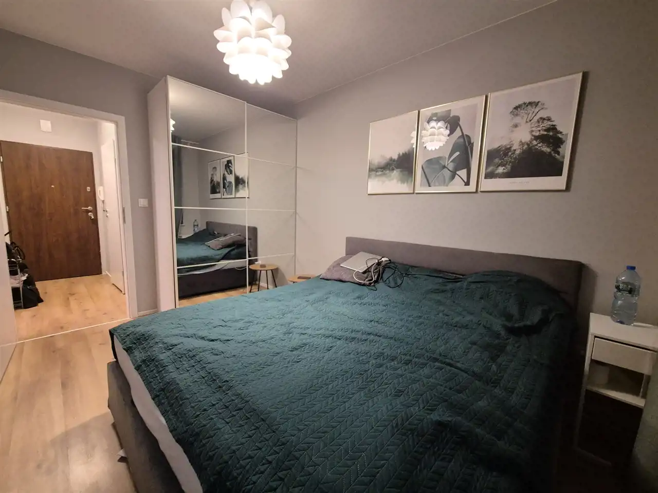 Sypialnia z dużym łóżkiem i szafą.
