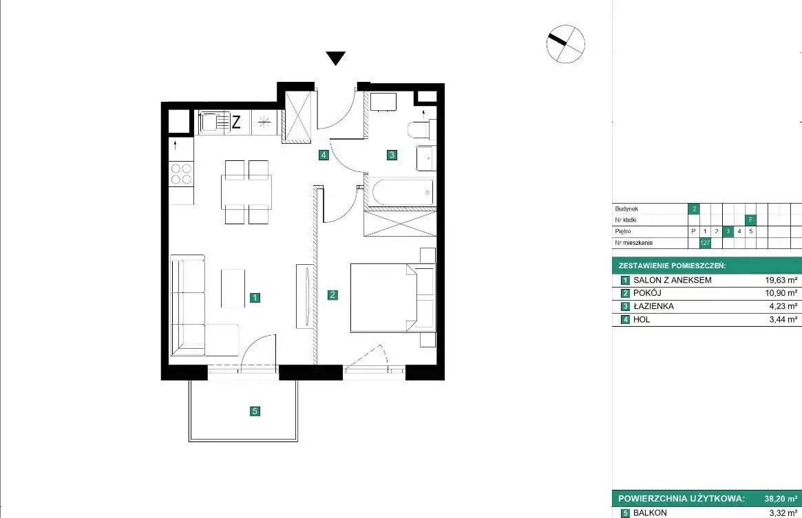 - Charakterystyka mieszkania 38.82 m2, 2 pokoje