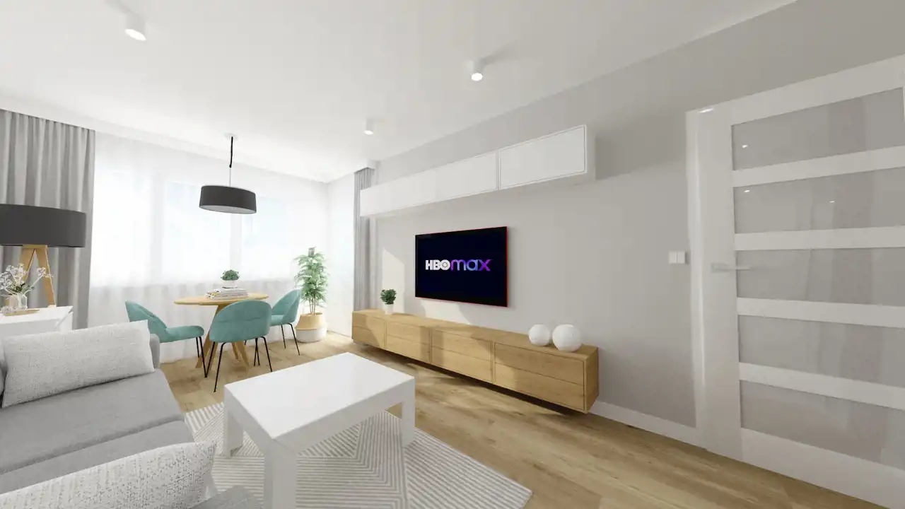 Pokój dzienny: komfortowy i gotowy do relaksu – z nowym telewizorem 55” oraz stolikami kawowymi.