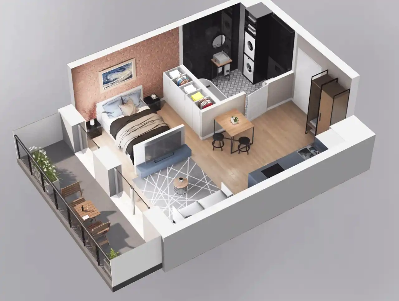 - pokoju dziennego z aneksem kuchennym (możliwość wydzielenia sypialni)