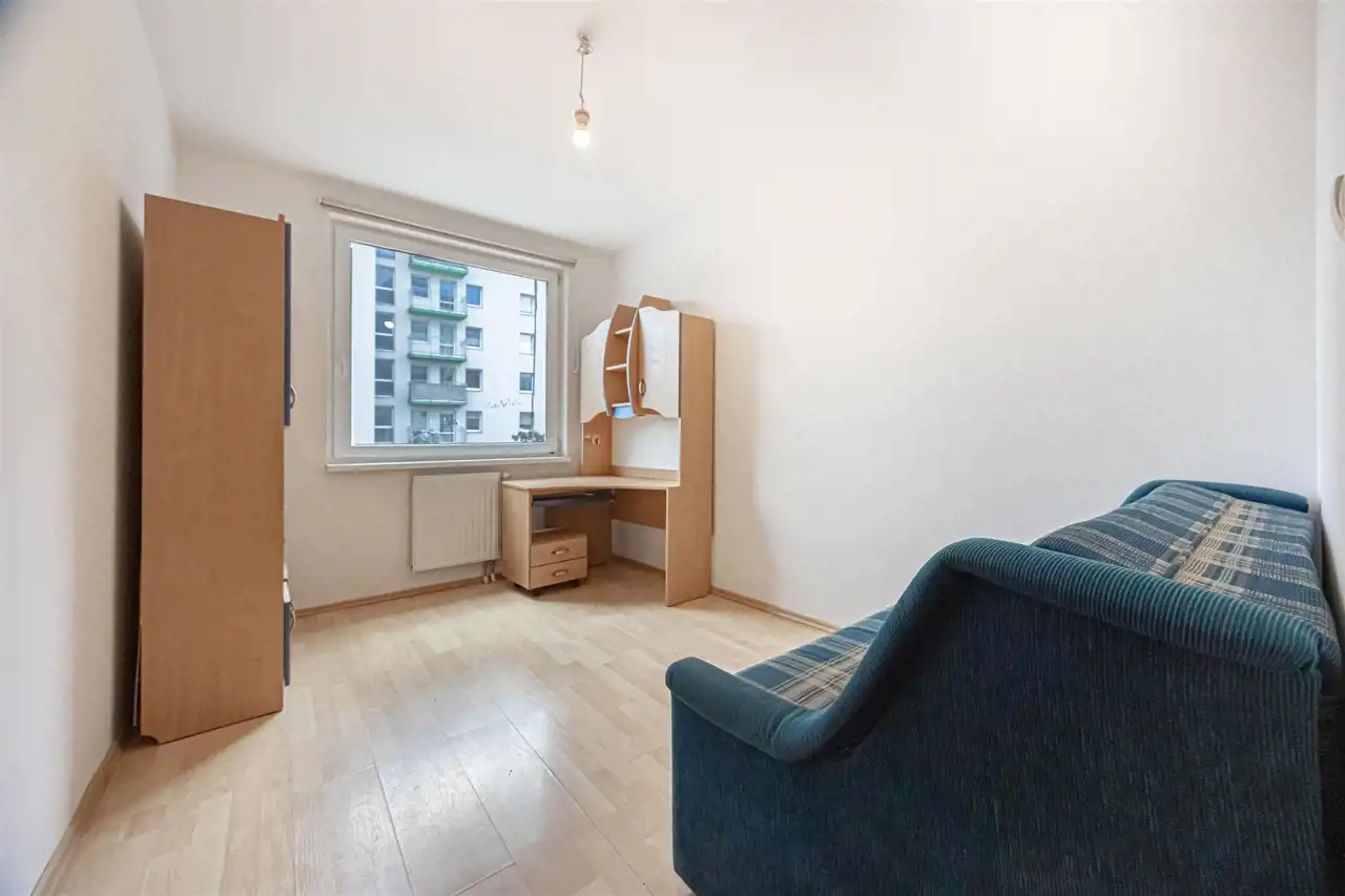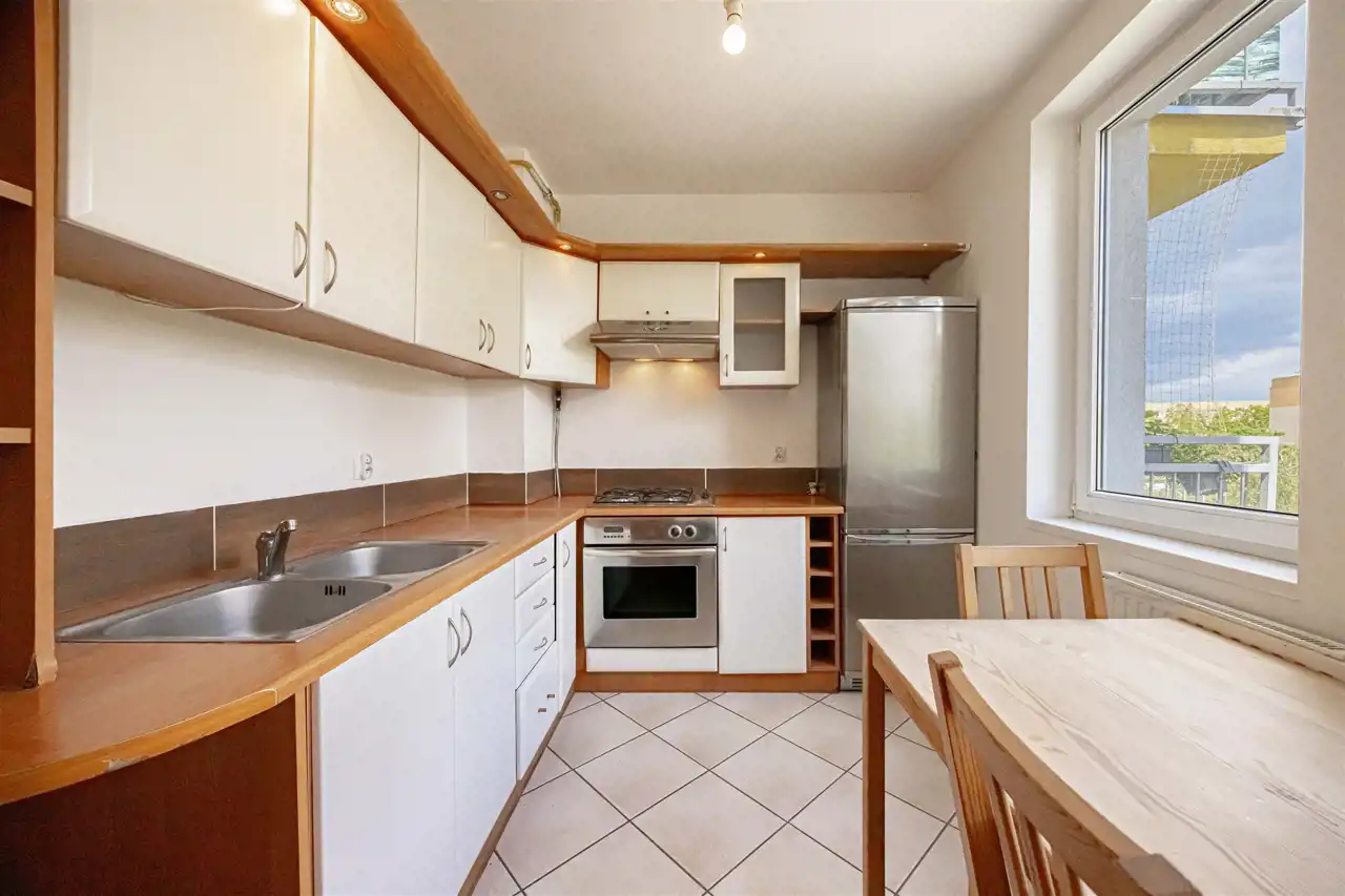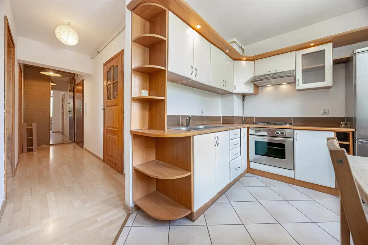 W pokojach panele. W łazience, kuchni oraz przedpokoju płytki. Okna PCV.