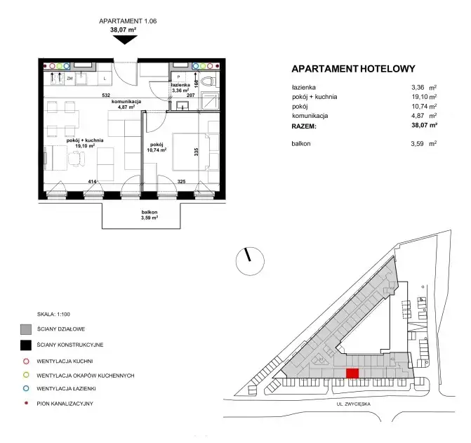 Na mieszkanie o metrażu 38,4 m2 składa się: