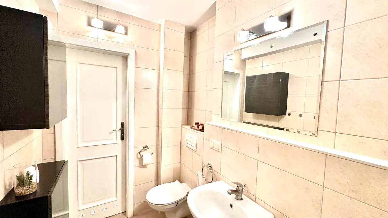 Na podłogach znajdują panele i kafle, okna PCV o bardzo wysokiej izolacji akustycznej, a także z praktycznie nowymi roletami materiałowymi.