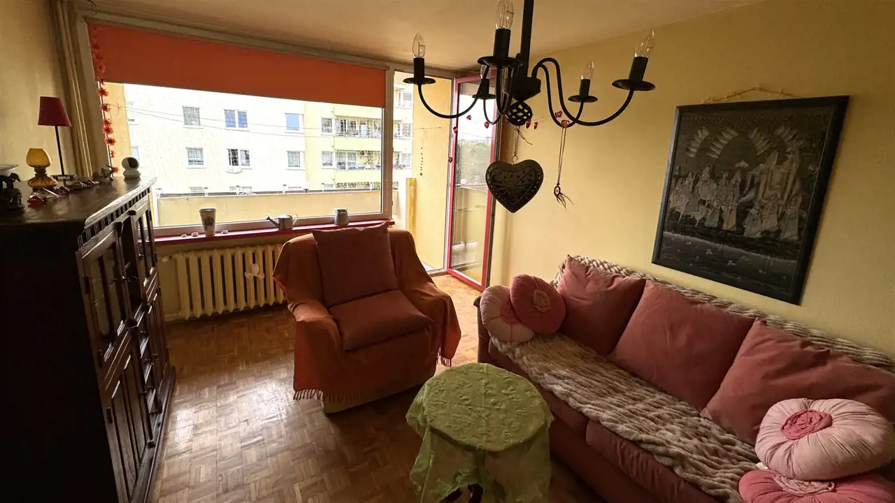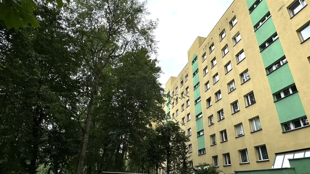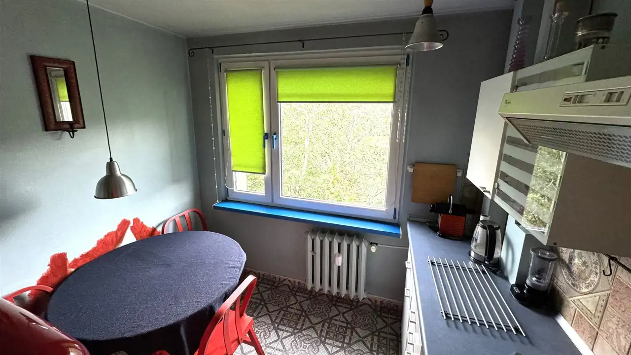 Dwustronne mieszkanie na 5 piętrze (winda z poziomu 0). Powierzchnia: 47,1 mkw. Spółdzielczo-własnościowe z Księgą Wieczystą. Dwa pokoje, kuchnia, przedpokój, łazienka z WC. Do pokoju dziennego (strona świata S-W) przylega duży balkon. W przedpokoju duże szafy w zabudowie. Drzwi wejściowe antywłamaniowe i wyciszone. Dobrze zagospodarowana niezależna kuchnia ze stołem i krzesłami. Łazienka z wanną. Do mieszkania przynależy piwnica. Ponadto do wspólnego użytku dla mieszkańców suszarnia oraz wózkownia.
