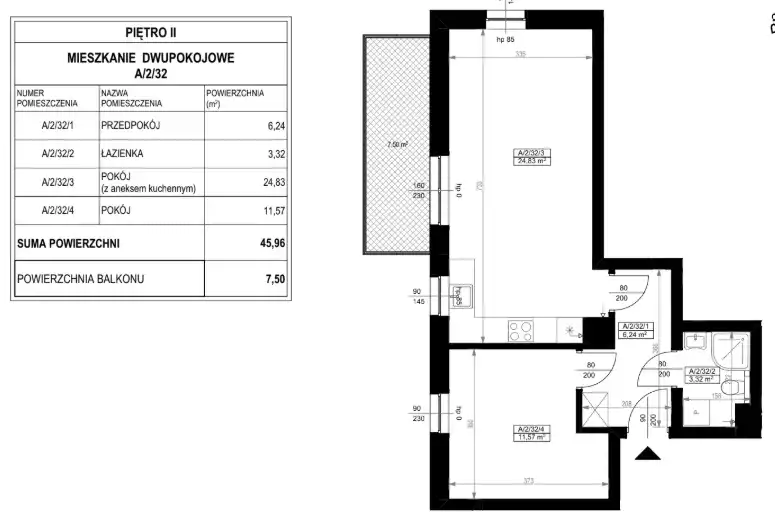 - Charakterystyka mieszkania 45.96 m2, 2 pokoje, do wykończenia