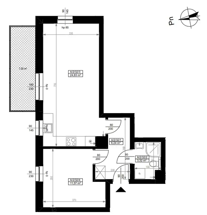 - łazienka – 3,32 m²