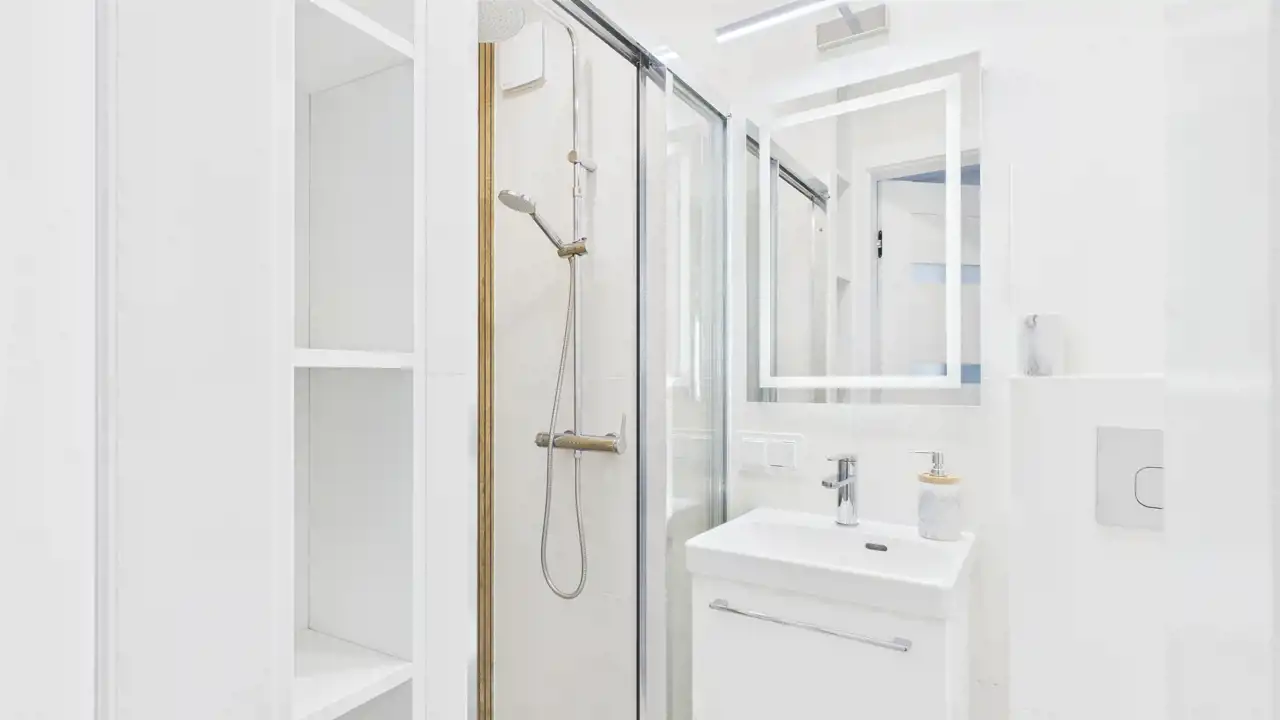 Łazienka: elegancka i praktyczna – wyposażona w przestronny prysznic typu walk-in, podświetlane lustro, pralkę, szafkę z umywalką oraz wiszącą szafkę robioną na wymiar.