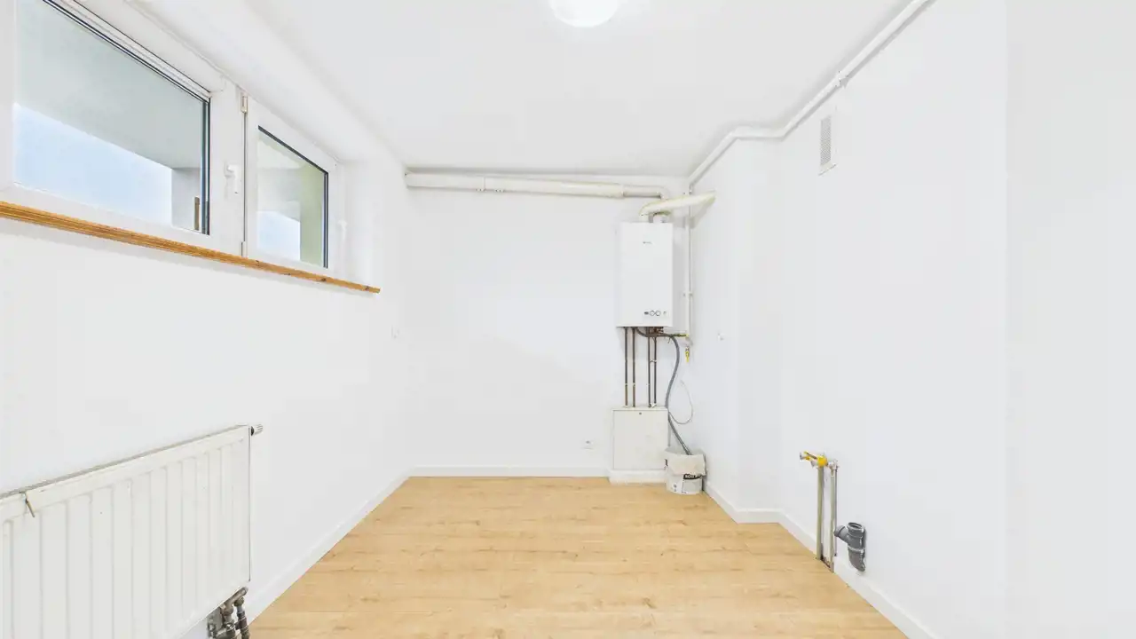Nieruchomość wyposażona jest w piec gazowy dwufunkcyjny, który odpowiada za ogrzewanie i ciepłą wodę.
