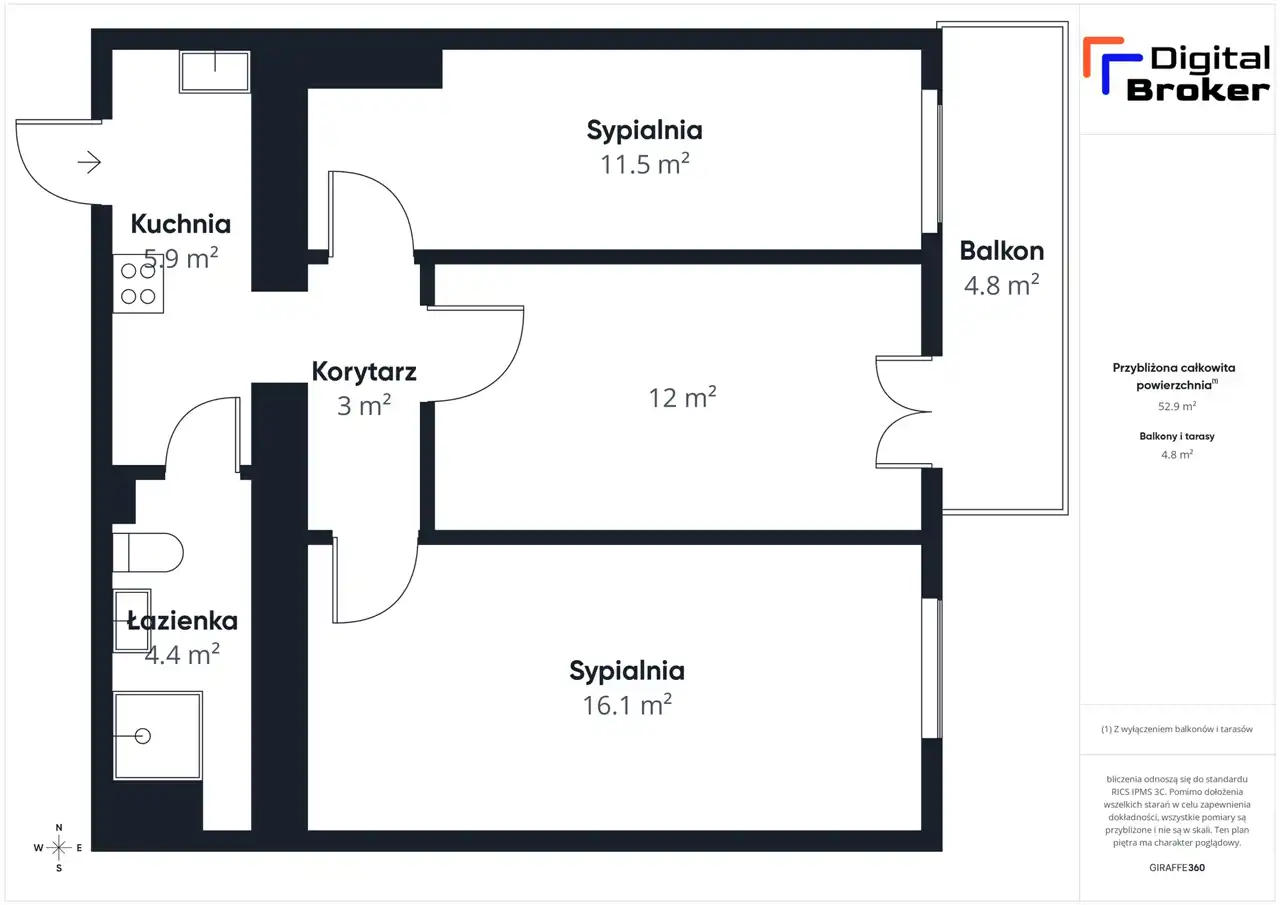 - Charakterystyka mieszkania 51.59 m2, 3 pokoje
