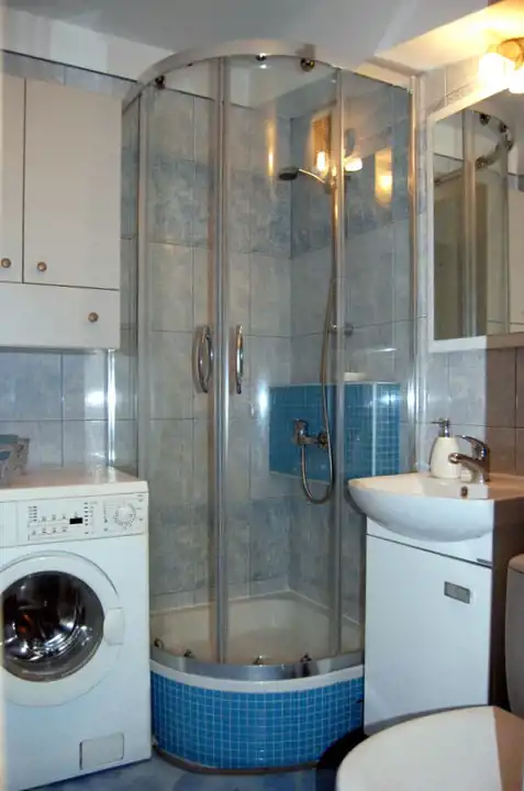 - Łazienka: 3 m² z kabiną prysznicową i pralką