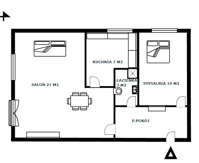 - Salon: 21 m² z kanapą, stołem i telewizorem