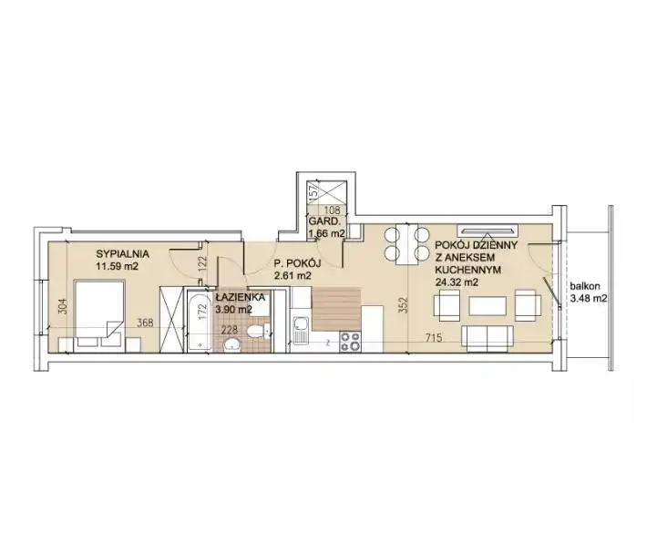 - Charakterystyka mieszkania 44 m2, 2 pokoje