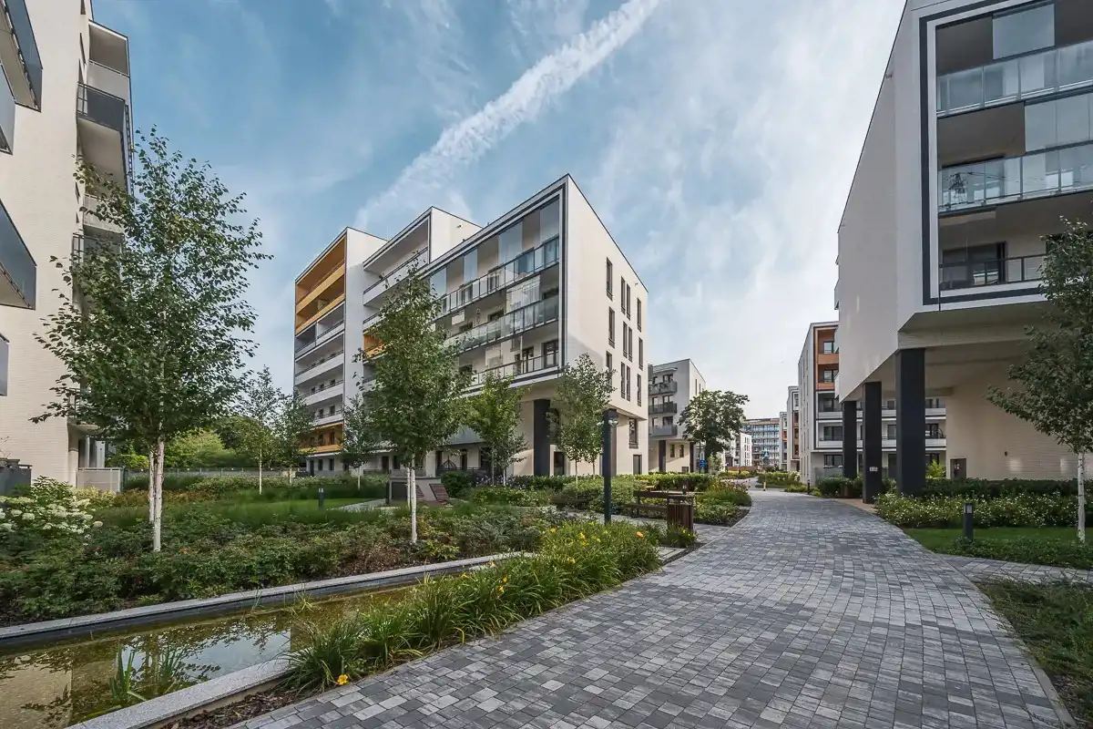 Inwestycja jest w trakcie realizacji, a zakończenie budowy planowane jest na wiosnę 2026 roku. Osiedle zostało zaprojektowane z myślą o wygodzie mieszkańców. Dużo zieleni, ścieżki spacerowe, ławki i estetyczne elementy małej architektury tworzą przyjemne miejsce do życia i odpoczynku.