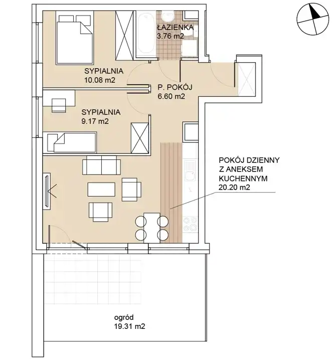 - Salon z aneksem (20,20 m²) + bezpośrednie wyjście na ogródek.