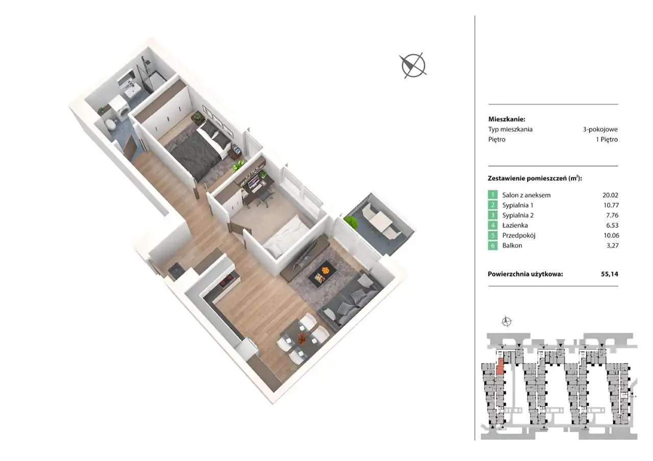 - Charakterystyka mieszkania 55.14 m2, 3 pokoje
