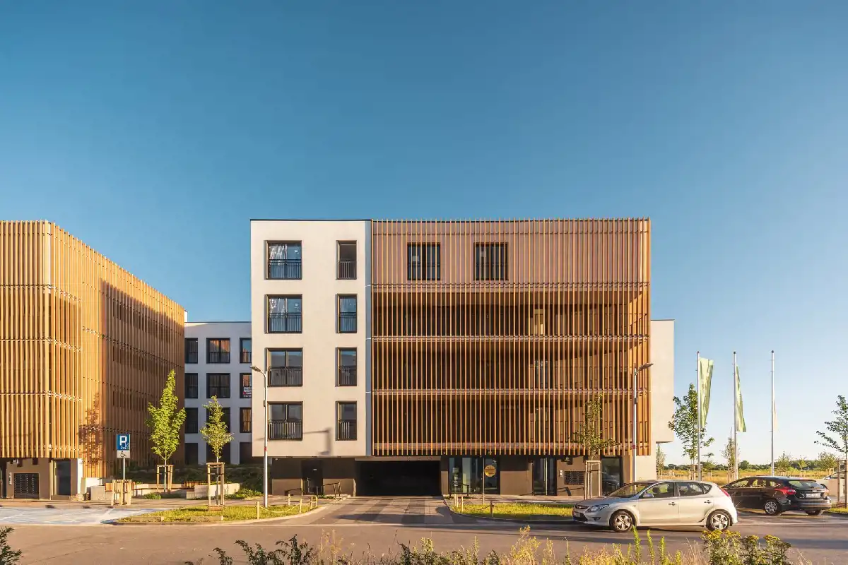 Inwestycję wyróżnia nowoczesna architektura, zielone dziedzińce i rozwiązania przyjazne środowisku – m.in. panele fotowoltaiczne, zielone dachy, retencja wody deszczowej i energooszczędne technologie budowlane.