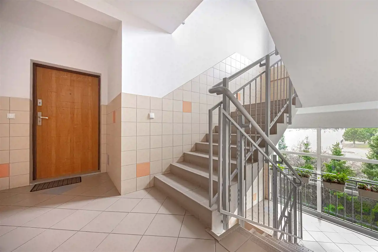 Klatka schodowa widna, czysta i zadbana. Wejście zabezpieczone domofonem.