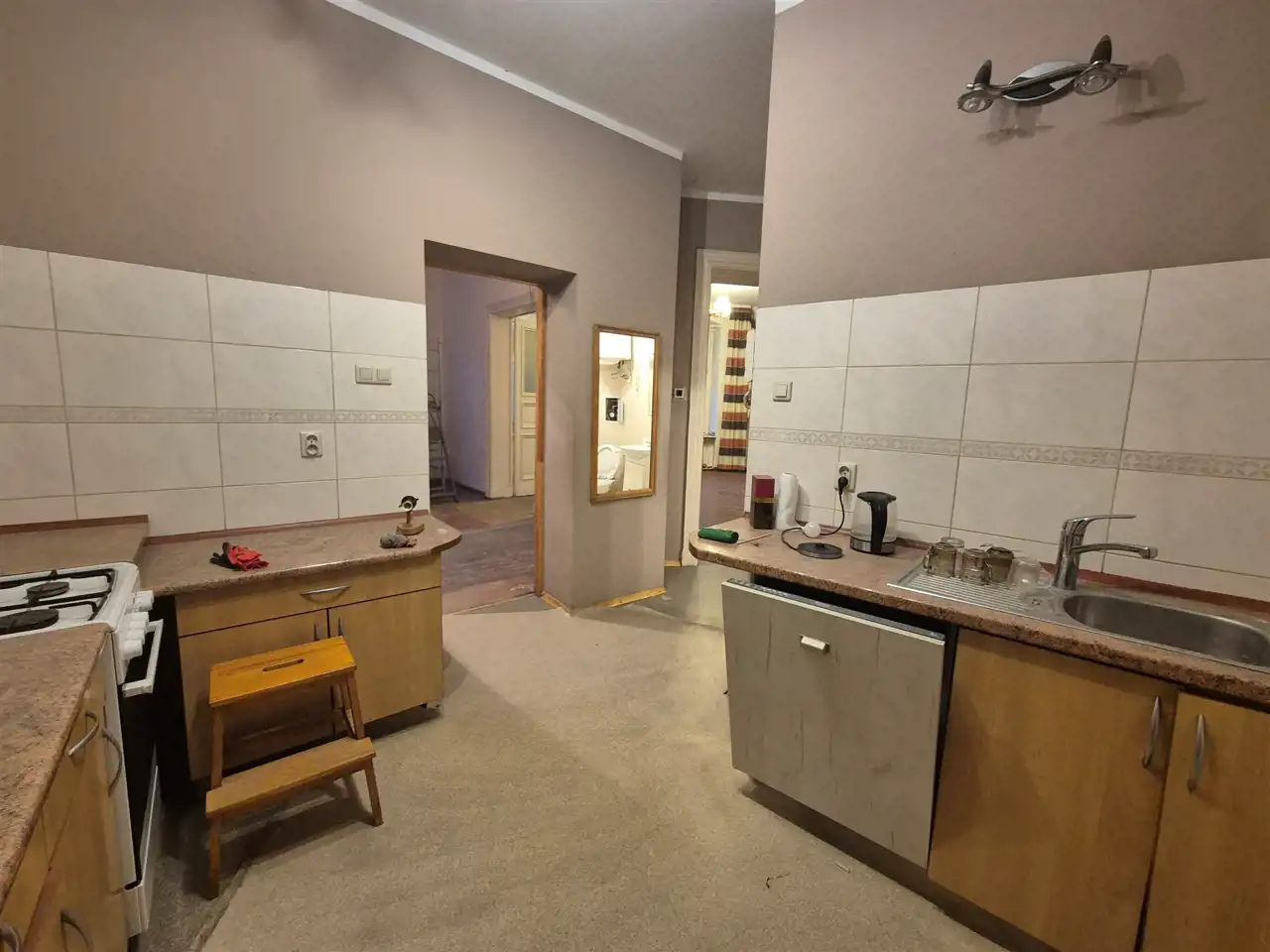 Obecnie w dużym przedpokoju zaaranżowana kuchnia z obniżonym sufitem.