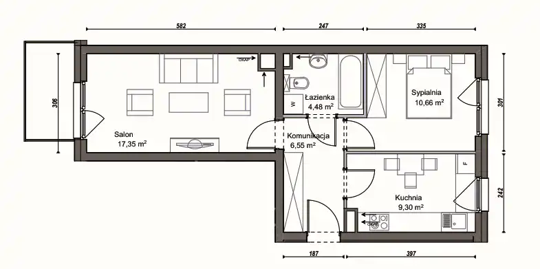 - Charakterystyka mieszkania 48.34 m2, 2 pokoje