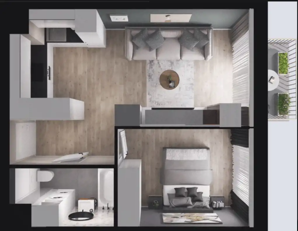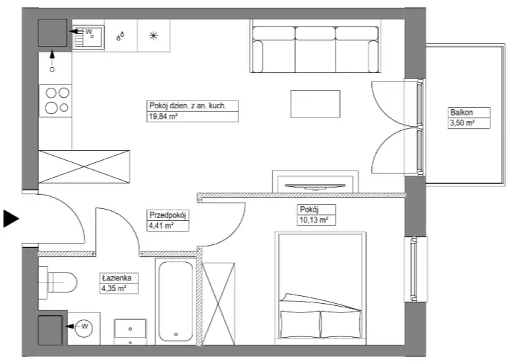 - Charakterystyka mieszkania 38.73 m2, 2 pokoje