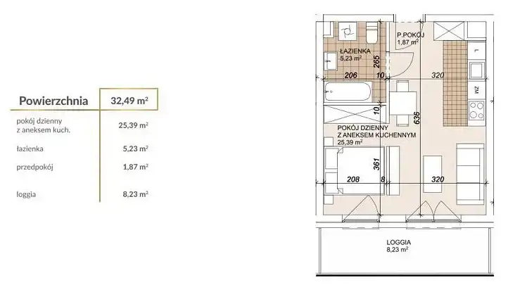 Prezentowane mieszkanie o powierzchni użytkowej 32,49 m.kw, składa się z salonu z aneksem kuchennym o powierzchni 25,39 m.kw, łazienki o pow. 5,23 m.kw, przedpokoju o pow. 1,87 m.kw. oraz balkonu o pow. 8,23 m.kw
