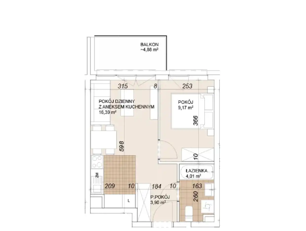 - Charakterystyka mieszkania 33.5 m2, 2 pokoje